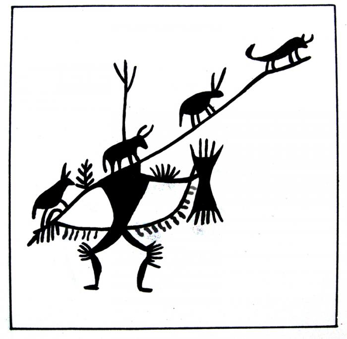 人们在此种思维与认识的过程中,一方面用人格化的方式去同化大自然,认为自然万物也具有像人一样的特性。如山有山神、水有水怪,日月星辰、风雨雷电也分别是一些人模人样的神灵。山崩地裂、洪水滔天等自然界的运动现象,均是由于这些神灵作用下的行为。在云南沧源岩画中有一幅山神图,从图中可看出这种思维方式对自然物象的神灵化表现:画面中,一道斜线体现出山坡的特征,山坡上是一群正在觅食的牲畜,山坡内有一个借助人的形态来表现的山神,山神的形体上长出了供牲畜生存的青草(图1-1)。通过此图形可明显看出万物有灵观念,以人的造型对山坡所进行的神灵化表现。