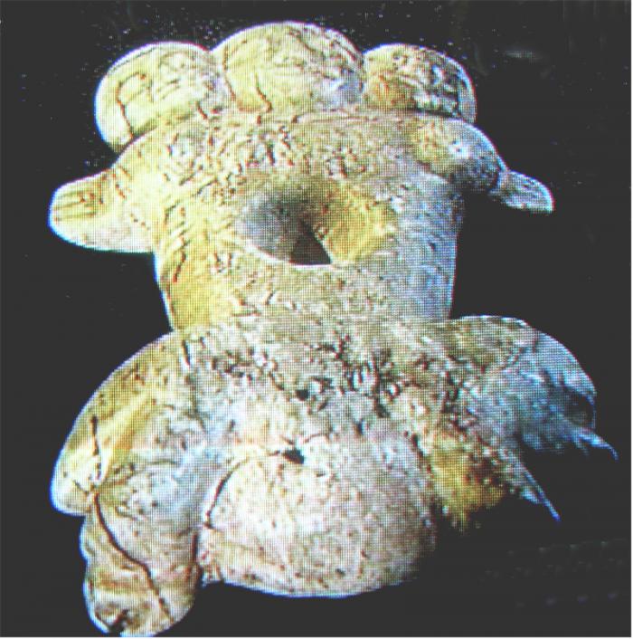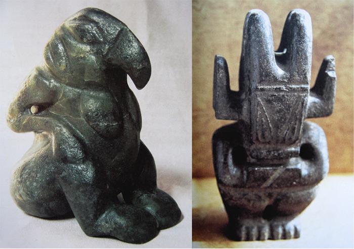 对于物象整体与物象局部的关系原始思维则认为:物象的各个部分并非仅是依附于该物象整体的一个局部,而是认为这些部分具有相对的独立特征。如原始图形中出现的男女生殖器、眼睛、手足等图形,这些器官或部分在原始意识中均可将其认为是脱离物象整体的独立神灵。在图形造型中,不同物象的不同部分还可以重新构合成新的神灵形象,并认为通过构合所产生的具有多种物种性质的神灵,更加具有神通广大的灵性,从而也使这些构合的形象超越物种的界限和时空的界限,成为了一种超自然的形象。这些神秘形象的造型是由人们的超自然观形成的,是原始思维认识自然万物并进行神秘“互渗”的结果。在原始艺术图形中可以看到大量的具有多种物象特征的复合式造型,如:红山文化玉器中的鹰首人身玉雕像和牛首人身玉雕像,其造型分别是鹰首、牛首与人身的结合物(图1-2);西安半坡出土的仰韶文化彩陶盆上的人面鱼纹,其造型是人跟鱼的结合物(图1-3);甘肃发现的一件齐家文化玉石器,其造型是一个有三首的人跟动物的结合物等(图1-4)。此类异物构合的造型形态,还可以在《山海经》中找到更多的例证。这些复合式图形的出现,是原始思维“互渗”形态的实证。而龙形象表现出的多种物类的复合式造型,也正是在这种思维形态中产生的。了解了原始思维的这些特征,就可以帮助我们提供这样一条思路:龙起源的原本因素并不一定是起源于某一种完整的动物或某一种自然现象,而极有可能起源于人或动物中被人认为具有神秘灵性的某个部分,这个部分在原始时期的思维方式下被人们认为与生命的繁衍、氏族的壮大密切相关,从而被人们崇拜并神化为一种神灵。在对这种神灵的图形表现中,又将其与其它生命物的某些部分相构合,从而产生了龙造型超自然的神秘形态。