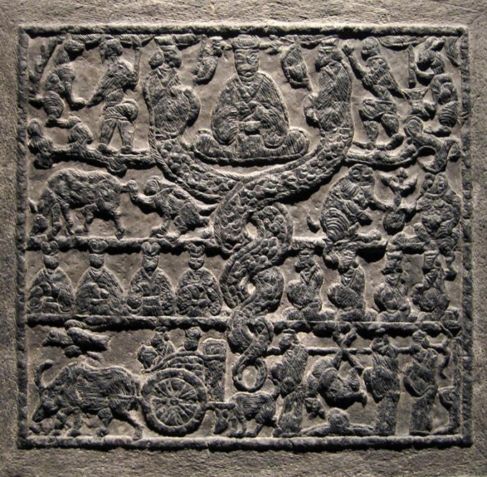 组合式是用多种物象组合来表现事物或观念的一种方式,它由多个物象组合成一个会意式画面。此方式又可分为两种形态:一种是反映客观事物自然状态的写实形态,它表现的是写实的自然时空关系及现实性的情节内容。如云南沧源岩画中的牧牛图(图1-17),成都杨子山出土的汉画像砖中的观伎图(图1-18)等,均是用较写实的形态组合出一种自然时空关系的画面。另一种则是打破自然时空秩序表现超现实形态的造型组合,如:青铜器上的某些图饰利用龙、凤和其它符号图形的组合来体现图式要表达的礼制理念(图1-19),战国楚墓帛画《龙凤升天图》利用龙、凤、人物的组合会意出龙、凤引导墓主人亡灵魂魄相合的升天幻境等(图1-20)。这些图像均是一种超自然时空的形象组合。