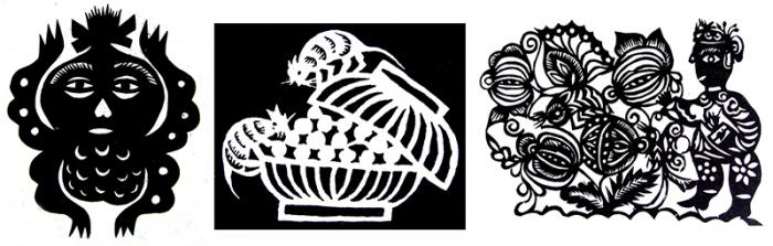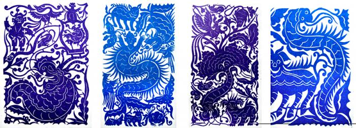尽管“形声”字的造字方法是形与音的组合,表示的是汉语的语素,与单纯的图形有所不同,但这种在图形类别的基础上再加以不同个性特点的造型方式在图形造型中却是经常地运用。如龙的原始图形中就有不同个性特征的龙,这些龙将相同的体部形态与不同动物的头部进行组合,从而形成了不同龙的自身个性,表明这些龙是在共性概念的基础上(相同的身体)与不同个性特点(不同的头部)进行组合的造型体现。红山文化玉龙中就有猪形龙、马形龙、鸟形龙、猴形龙、鱼形龙、狐形龙等,它们均具有相似的条带形身体,但却又各具有不同物类的头部(图1-22)。苗族剪纸中也有牛龙、人头龙、花尾龙、蜈蚣龙、翼龙等不同类型的龙(图1-23)。在原本艺术的图形造型中,用此方式来区分同一类物象中的具体个物,是图形造型的一种重要方式。由此也可看出:在同时期的龙图形中就存在有不同的物类个性特征,并且这些龙图形之间从物类个性特征上并没有演变传承的关系,表明龙的原形物并非单纯是由某种动物演化而来的,它的内涵既关联到多个物种,又具有共性的崇拜内容。