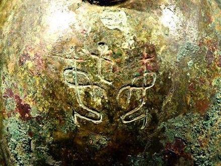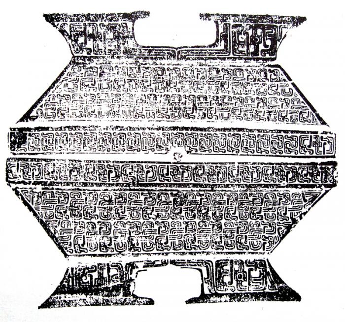 “指事”的方式在图形的造型中,往往表现为用某种符号介入的方式来标示出图形形象的特征、地位和身份。如云南沧源岩画在人的图形上配以太阳或植物的符号来表示日神(天神)与地神(图1-12);青铜纹饰中在龙头或兽面上加“辛”“且”等符号来表示它们的神性及地位(图1-13);许多的古代器物上也常用加徽号文字的方式来标识器物的身份等(图1-14)。这种用符号介入图像来表示图像特征及身份的标示方法,在与社会的等级观念和礼乐制度结合后就变得更加突出。龙形象的使用,后来也与人的身份和地位密切地联系起来,成为了一种标识符号。在图形文化的解读中,如果弄清了这些标识符号的意义,也就往往弄清了被标识对象的内涵及特征。