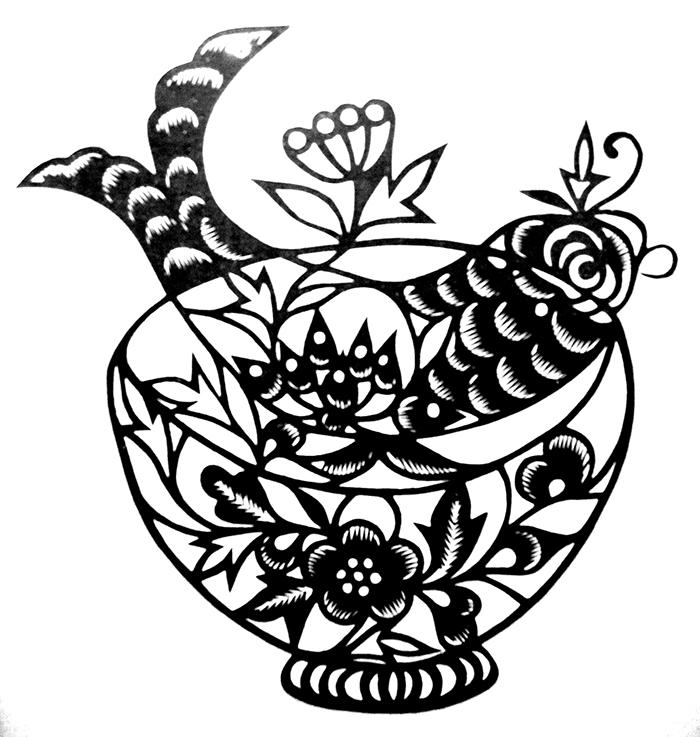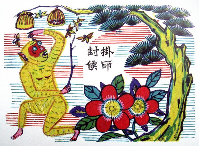 假借的方式在图形造型中也同样经常出现,特别是对神灵这样一些超现实的虚幻形象和一些需用可视形象来表现的抽象概念,就要借助于现实形象或创造超现实形象来表现。如在汉画像石中以动物相“咬”谐“交”,以“虎”谐“护”。又如东、西、南、北四方分别借青龙(东)、白虎(西)、朱雀(南)、玄武(北)四灵来标示,并按上朱雀、下玄武、左青龙、右白虎的位置标示方位特征等(图1-27)。民间美术也常假借与文字谐音的物象来表达某种抽象的概念。如“连年有余”利用谐音假借的方式画莲花(连)和鱼(余)来组成画面,使“连年有余”这个本来抽象的概念成为可视的形象(图1-28)。又如画蜜蜂(封)蜂窝(印)和猴子(侯)谓“挂印封侯”(图1-29);画喜鹊(喜)站立(上)在梅树(眉)枝头(梢)谓“喜上眉梢”(图1-30)等等。