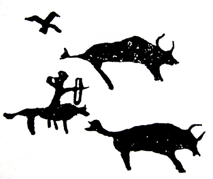 综合意象的最初表现首先来自于对物象基本形状和行为特征的印象。如在大多的原始岩画中,人们创作岩画时不可能也没有必要面对行踪不定的动物去进行写生,他们创作岩画的目的也不在于使其描绘的形象从具体细节上去接近对象,而是出于巫术等功用目的将图像作为一种符号象征。这些图像大部分只有物类的划分而没有个物的区别,他(它)们脸上没有五官,身上也没有以美化为目的的纹样装饰(图1-50),其造型特征反映出了原始时期人们对物类关注要高于对个物关注的视觉意识,这是因为他们在面对对象时,首先需要区别哪是同族?哪是各类不同的猎物?而不是同物类中的个物差别。由此也可看出:在原始时期生存的实际需要是至关重要的,它高于审美需要。人们的这种需要被真实地反映在了当时的图形文化中。