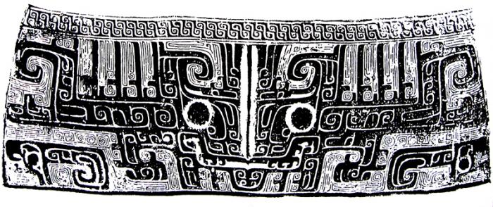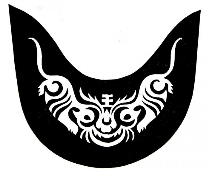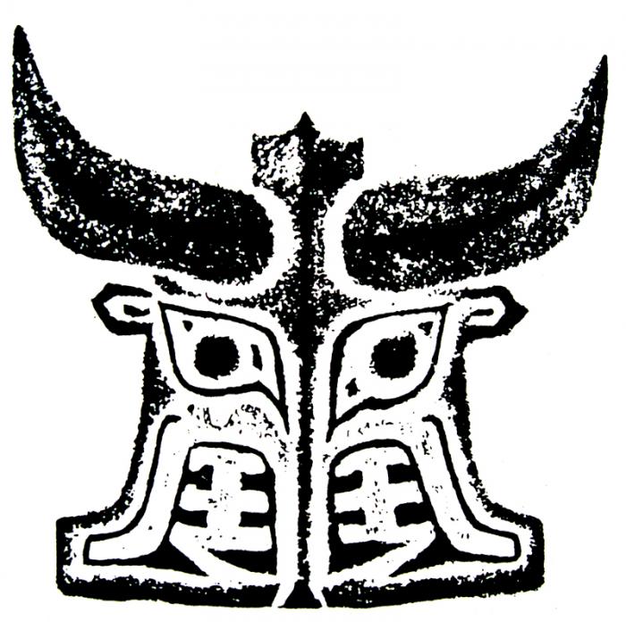 表现物象综合特征的图形在原本艺术造型中有多种方式的体现。其中经常看到侧面和正面合而为一的形象,这种造型的出现是人们在造型意识中认为:一个完整的正面是由两个侧面组成的,物象包括了正面和侧面的不同特征时才是完整的。此种意象是由人们对物象的全面经验和整体印象决定的,如商周时期青铜器上所谓的饕餮纹(或称兽面纹),实际就是由两个侧面的龙造型所组合形成的正面龙形象(图1-51)。这种正面的龙纹作为青铜礼器中的主纹饰,代表着特殊的身份和地位,其运用多角度并具有象征性意义的综合式形象进行造型,则更能表现出其庄重、完整、全面的形象特征。类似的正面与侧面综合的造型方式,在民间美术中也常常见到(图1-52),其同样也是物象综合特征的图形体现。