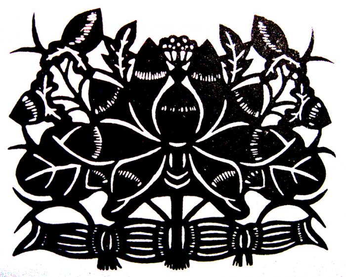 对事物完整意象的造型还可以把不同的时空形态组合在一起,或把事物发展的时间过程表现出来。如在这只猫的造型中(图1-56),猫所具有的形体特征(身躯、四肢、乳房、尾巴、头、以及头上的两支眼睛、两个耳朵、鼻子、嘴巴、牙齿、舌头、胡须、皮毛等)一样不缺地被全部表现了出来,这种表现方式是出于人们对猫的整体印象。除此之外,该图形中的猫还在一面给小猫哺乳,一面又在捕鼠。哺乳小猫和捕鼠均是猫的特征,可实际中猫是不可能同时去做哺乳和捕鼠这两件事的,而在此造型中突破时间的限制去这样表现,其同样是出于对猫综合意象的体现。又如民间艺术在表现莲花时,把开花、生蓬、结藕不同时间出现的现象组合在一起,也是出于对莲花综合意象的体现。∶(图1-57)。