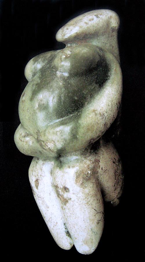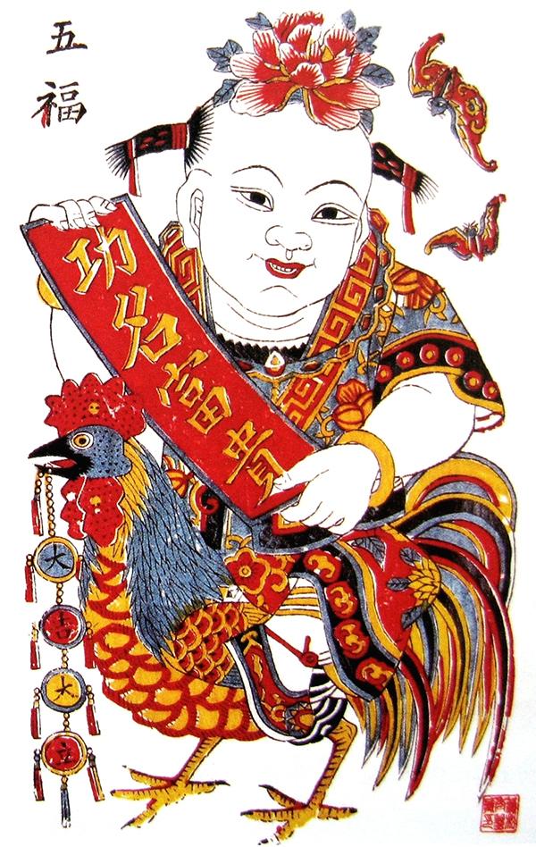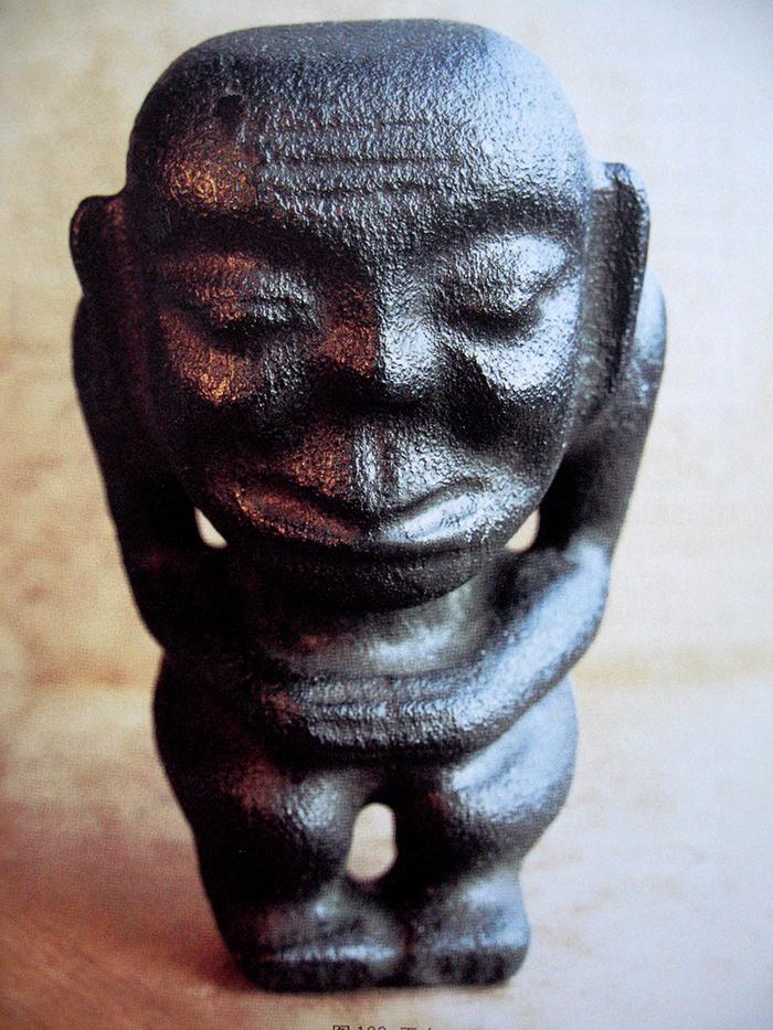 原本艺术的造型的特征,还表现为不刻意追求自然物象的表象复制,而是在事物意象的基础上去表达主观的意愿,这种意愿所形成的艺术形象是以对物象的主观表现为主导的,由此致使原本艺术的造型手法,在对意象原型表现时进行主观的夸张和取舍也是必然的。其夸张手法多表现为:把主观上认为体现物象特征或具有神性的重要部分加以强化,其次要部分简化甚至省略,以此来体现对物象的主观认知及审美意愿。如:红山文化中的这件玉雕女祖像,其为了表现对母性的生殖崇拜(图1-58),夸张地表现了隆起的腹部和膨大的乳房,而缩小了头部并省略了五官和下肢,使其对生殖特征的体现更加突出明显。同属红山文化的另一件族长玉雕像造型则与此不同,由于该表现对象不是神灵,而是氏族中一个举足轻重的现实人物,故其夸张部位也有所不同,为了表现对象的形象特征,其面部五官运用了较为写实的表现手法,夸张突出了头部,缩小了身体的比例,从而使这个神态安祥的老者面貌特征更加突出(图1-59)。此类对物象进行夸张与省略的方式在民间美术造型中更为多见。如在民间木版年画和泥、布、面玩具中,夸张人物或动物的头部而缩小其身体的造型,也均属此类(图1-60)。